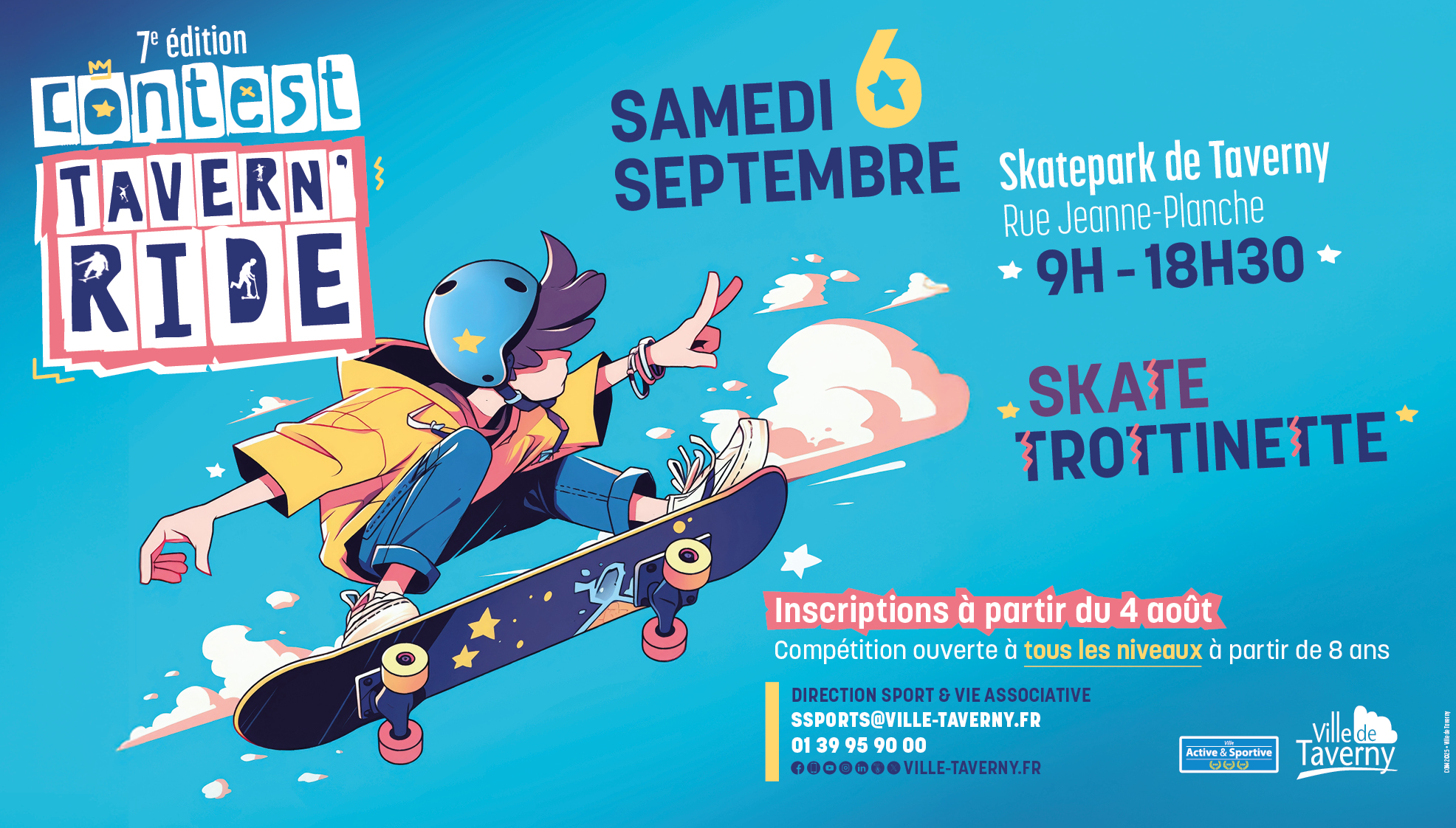 Manifestation sportive de trottinette et de skate organisée samedi 6 septembre 2025 au Skate Park de Taverny. Animations gratuites et ouvertes, à partir de 8 ans.