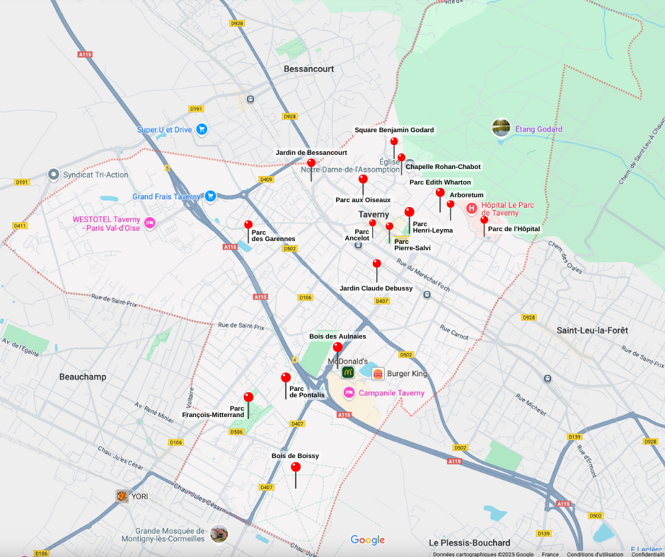Les espaces verts communaux sont composés de plus d'une dizaine de parcs et jardins, mais aussi d'espaces plantés particuliers tels que l'Arboretum, la vigne communale, ou les jardins familiaux sur la dalle A115.