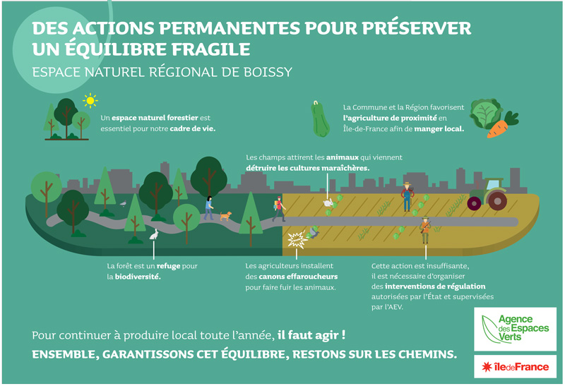 [ Mai 2019 ] L'Agence des espaces verts vient d’installer des panneaux dans la plaine maraîchère de la propriété régionale de Boissy. Cette signalétique, à l’attention des promeneurs, explique les actions mises en œuvre par l’AEV sur ce territoire, avec l’objectif de favoriser l’agriculture de proximité, maintenir la biodiversité des espaces naturels et garantir un accueil du public de qualité. Notamment, les interventions pour limiter la dégradation des cultures par les pigeons et lapins (dont les populations sont en croissante constante sur le site) y sont explicitées.